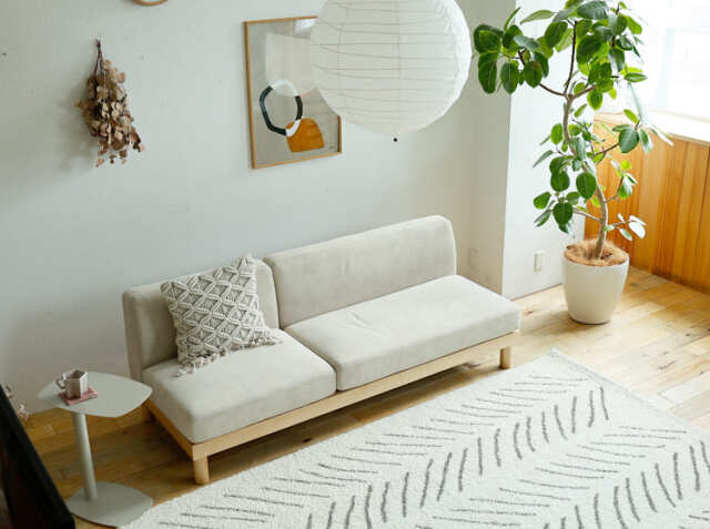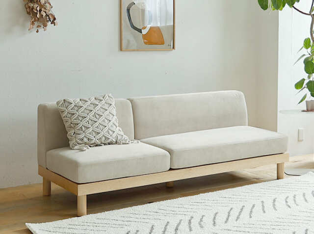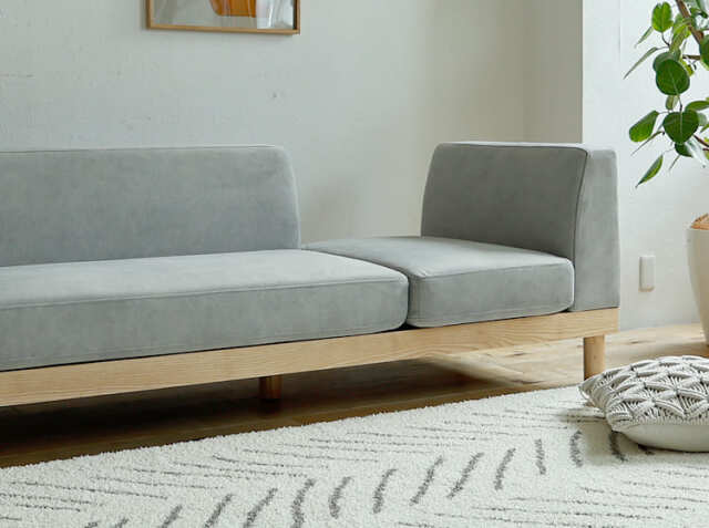アッシュ材を使ったフレームと肌触りの良いファブリック生地を組み合わせ、シンプルながら上質な佇まいに仕上げました。座面はウレタンとポケットコイルで体にやさしくフィットし、長時間でも快適にくつろげますよ。