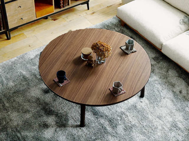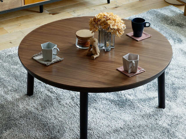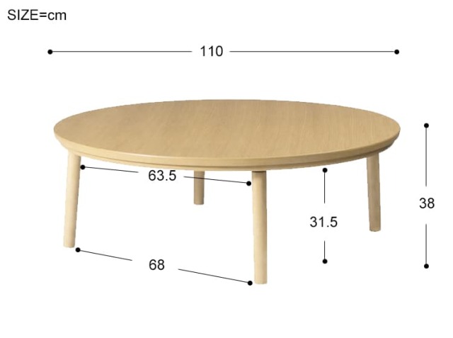 1年を通して活躍するこたつテーブル。ソファーに座りながら使用するのに丁度いい高さは38cm。またラグに座って脚をゆったりと伸ばして使いたいという方にもピッタリ。直径110cmというサイズは3人から4人で使うにはちょうどいいサイズ感となっています。