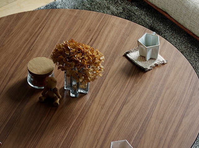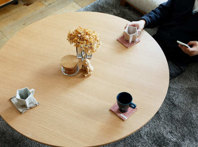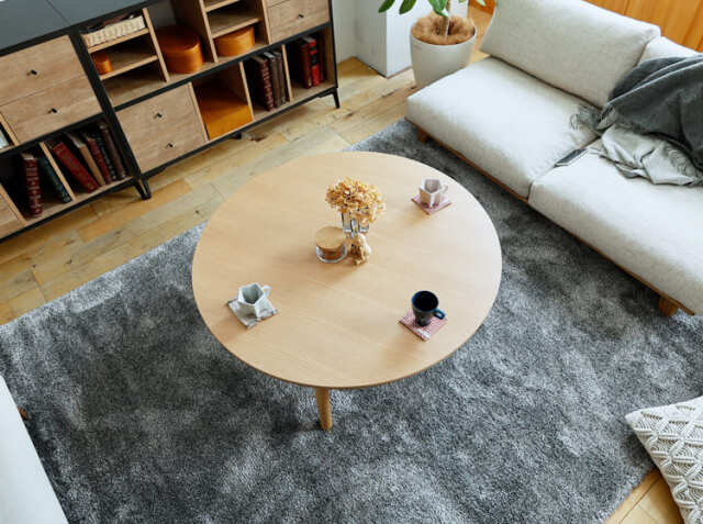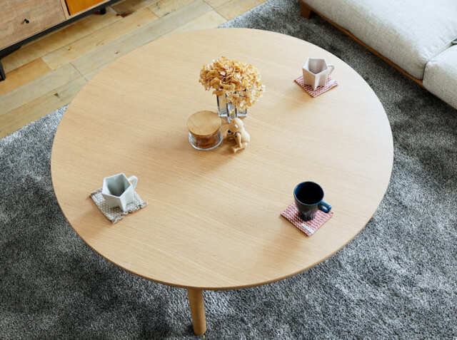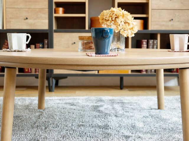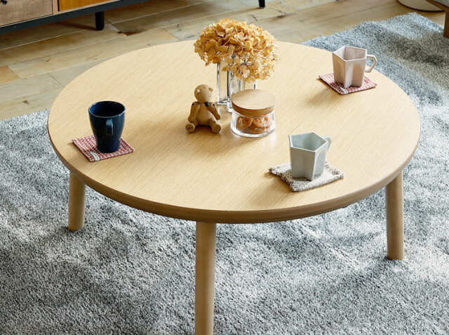 お部屋を柔らかな印象に仕上げてくれる円形デザイン。直径110cmサイズは3人から4人でのご使用にちょうどいいサイズ。角がないので、お部屋を広く感じられるのも嬉しいポイント。丸みを持った軽やかな天板と明るいナチュラルな色合いは、お部屋の印象を明るくしてくれます。モダンな布団カバーを合わせるのも素敵ですよ。