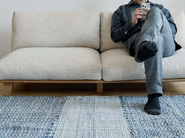 あぐらもかけるゆったりとした奥行きの広い座面と柔らかなフェザーとコシのあるウレタン、スピニングスポンジで、包み込まれるよう座り心地を実現した幅165cmのロータイプ3人掛けソファ、DELKA(デルカ)。