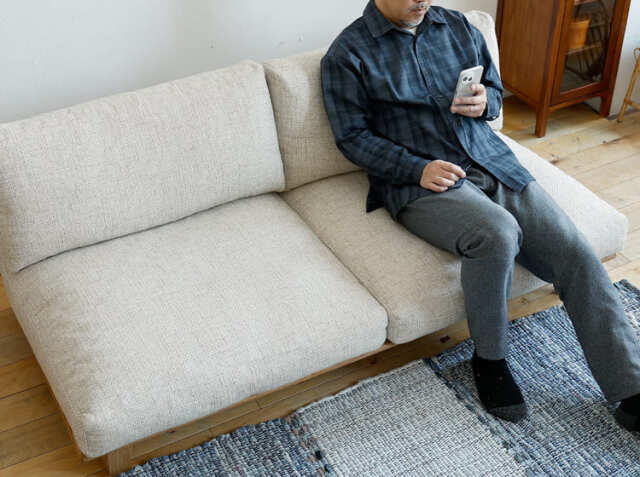 幅は165cm。サイドに木肘などがないタイプですので、大人の方が3人で座ってもゆったりくつろげるサイズとなっています。座面の奥行きもクッションを置いた場合でも59cmありますので、深い奥行きの座面はあらゆる姿勢でくつろぐことができますよ。
