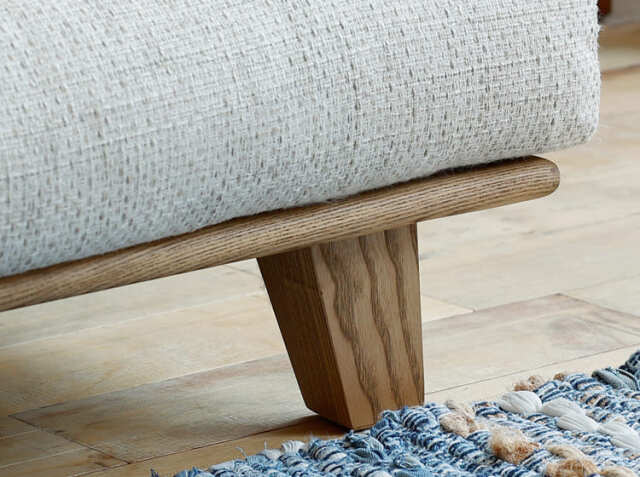 フレームや脚部にはオイル塗装を施した天然木アッシュ無垢材を使用。脚部の高さは標準的なお掃除ロボットも入ることができる13cm。フレームの角面は面取り加工を行い、丸み帯びたデザインを採用し、お洒落に仕上げています。