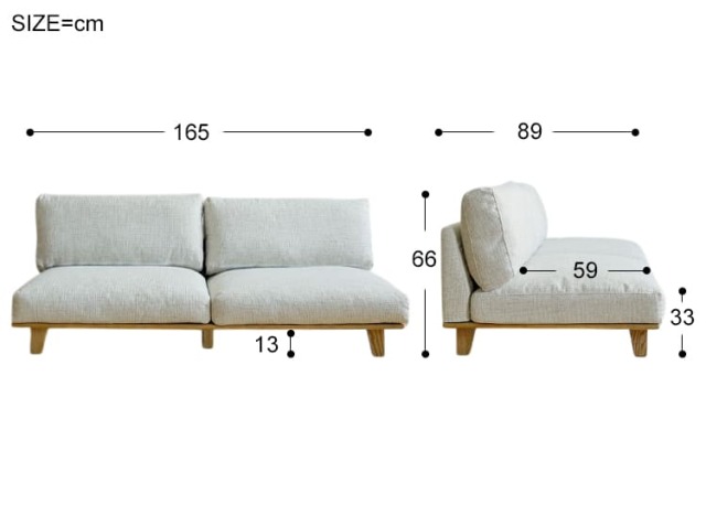 幅 165cm × 奥行き 89cm × 高さ 66cm(座面高 33cm) 脚の高さ:13cm |