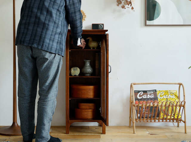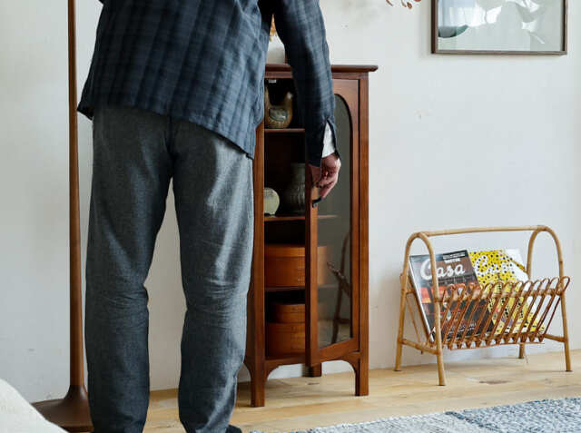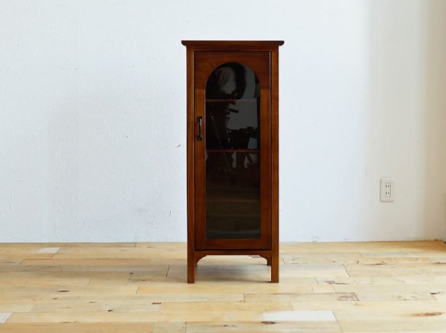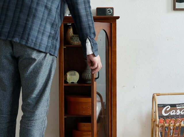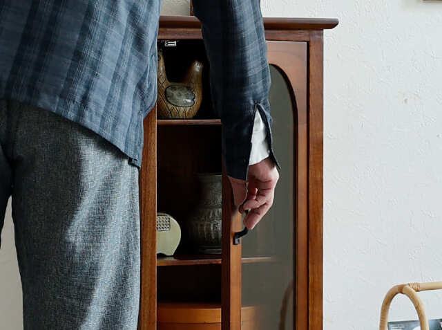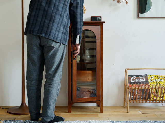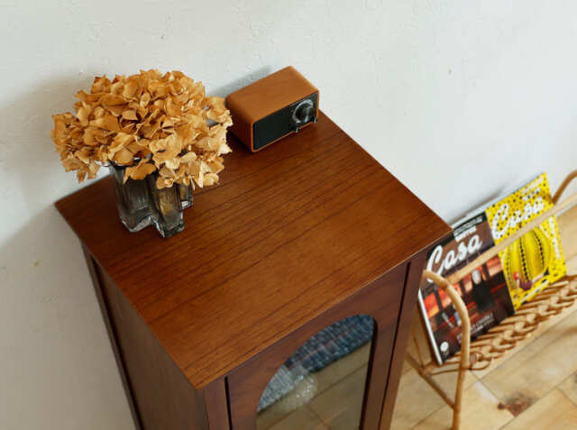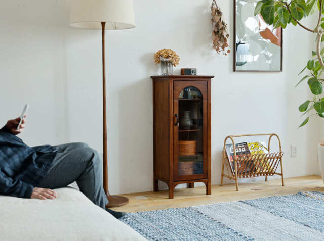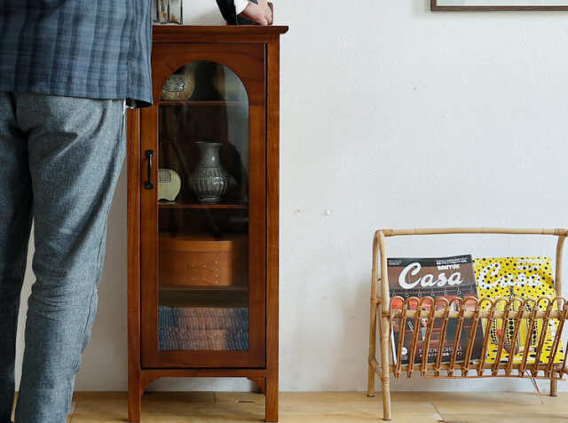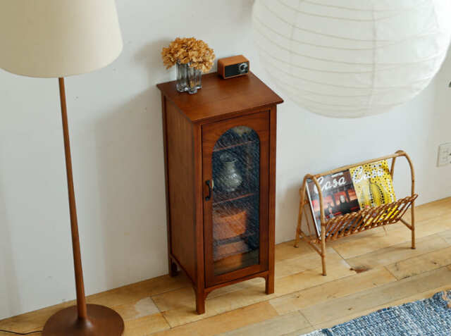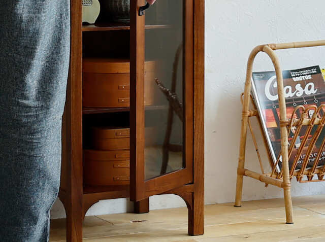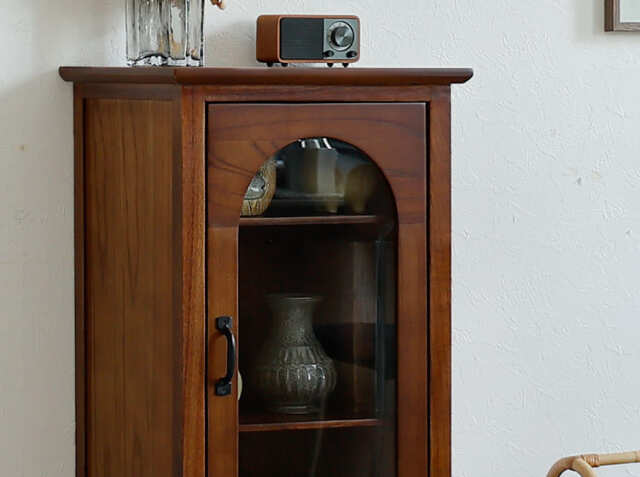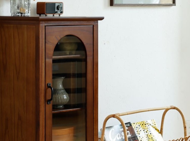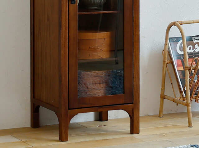 ヨーロッパのアンティーク家具のような味わい深いレトロテイストのデザインが特徴のガラス扉収納がついた幅40cmのキャビネット、Garba(ガルバ)。素材には高級家具や楽器などにも使われる天然木ミンディ材を使い、天然木の家具ならではの温もりや、使い古されたような風合いが、ほっこりとしたリラックス空間を演出してくれます。
