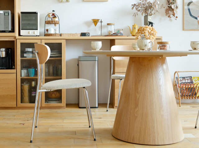 丸タイプのダイニングテーブルは、限られた狭い空間を広く使えるというメリットもあるんです。他のインテリアが多くて、スペースが限られていても置きやすいのが嬉しいポイントです。