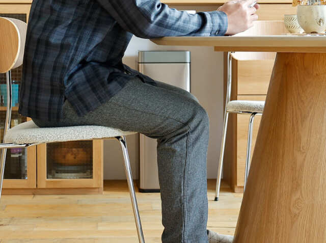 こちらのテーブルは反りを防止するための幕板がない仕様となっていますので座った時に、足元の空間にゆとりが生まれリラックスしてお食事をすることができます。高さは72.5cmとなっていますので、標準的な座面高のチェアにピッタリのサイズとなっています。※画像のチェアーは座面高47cm。