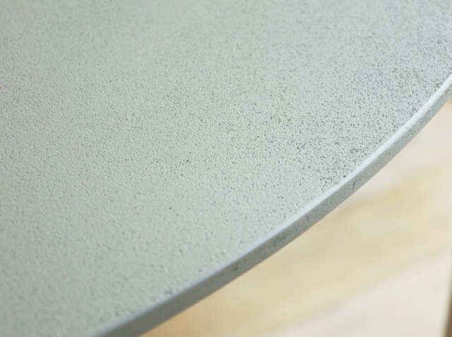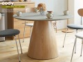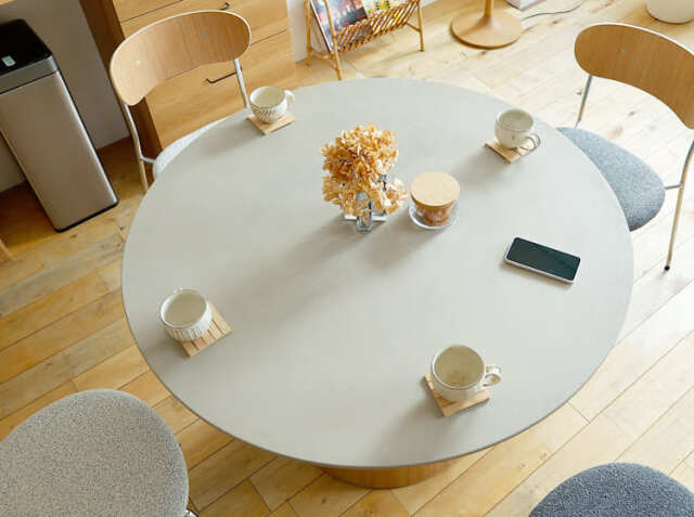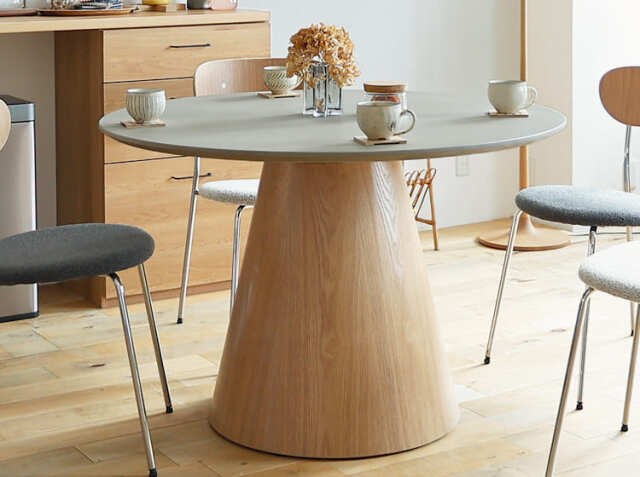 モルタル塗装で仕上げたコンクリート調の天板と木目のきれいな天然木を使用したシングルレッグが特徴の4人家族でご使用いただくのにちょうどいい幅110cmの円形ダイニングテーブル、Cody(コディ)。天板には耐久性・耐水性に優れ、永くご使用いただくためにモルタル塗装の上からウレタン塗装をコーティングしています。