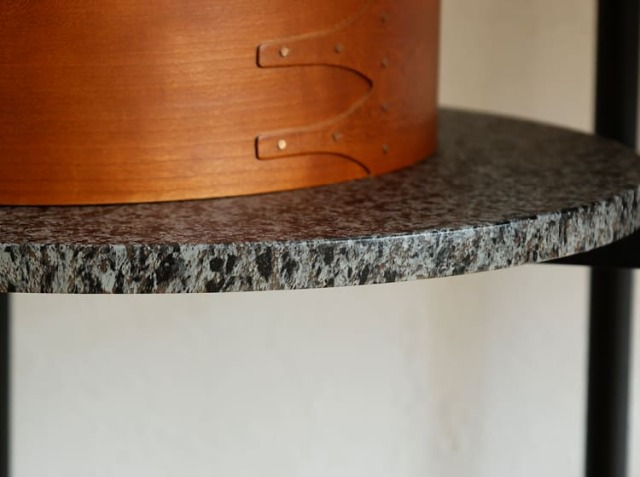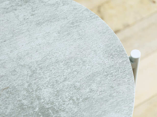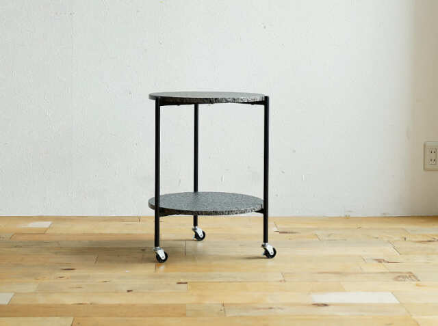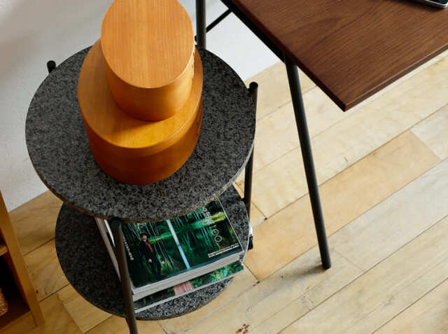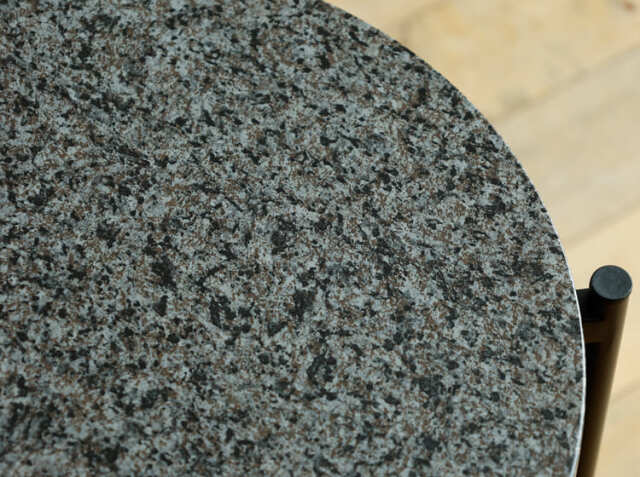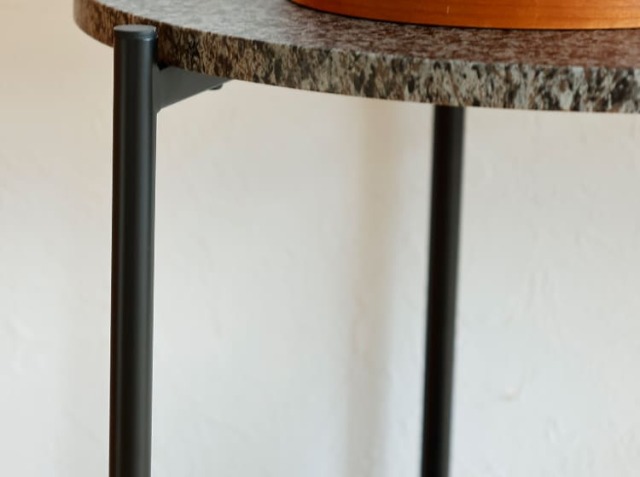 石目調の円形天板とスチールを組み合わせたミニマルなデザインが特徴の円形サイドテーブル、Prots(プロッツ)。カラーは、ダークグレーとライトグレーの2色からお選びいただけます。