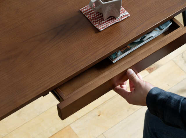 引き出しには、外観のデザインを損ねないように掘り込み型を採用しています。引出しは開けた時に落ちないようにストッパーが付いています。