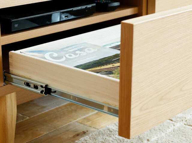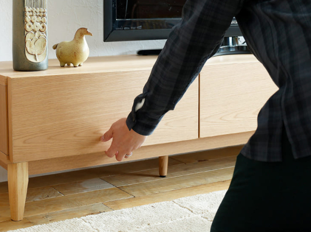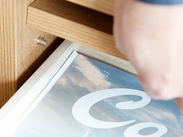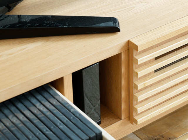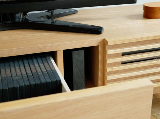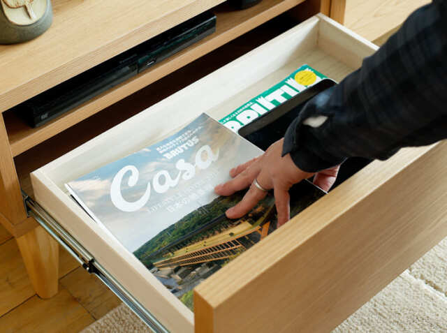 生活の中で増えていく物。そんな物の中には、生活感が出ないよう隠して収納したいという方も多いのではないでしょうか。左側の引出しを開けると、AVデッキなどを収納するスペースとリモコンなどを収納するのに便利な高さを抑えた引出し収納の2つの収納となります。