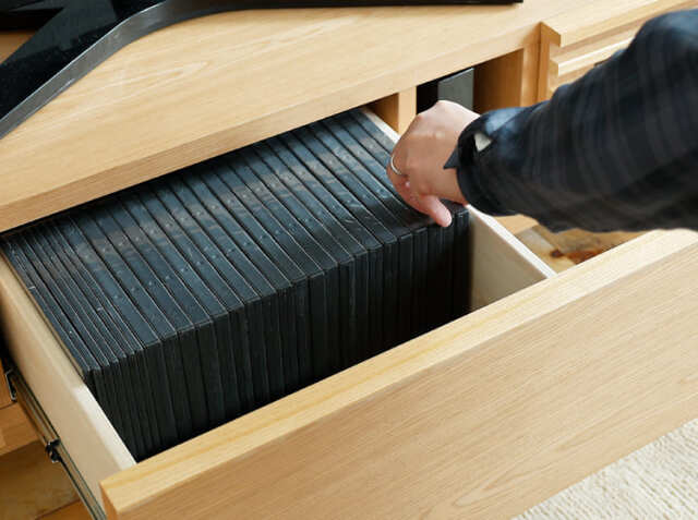 左右の引出し収納内のAV機器を置く棚板は取り外すことができる可動式となっています。