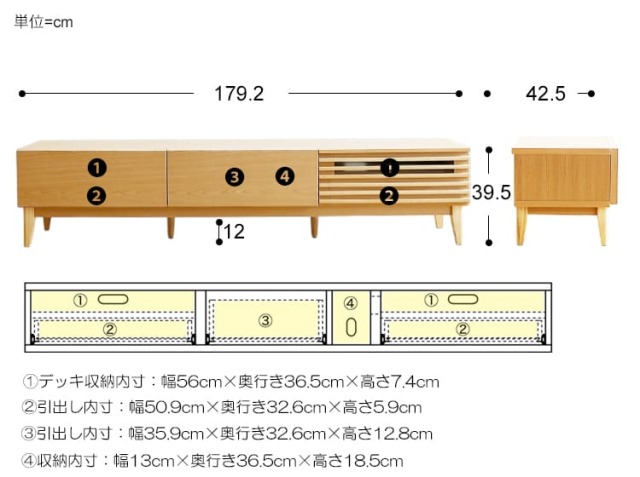 本体:幅 179.2cm × 奥行き 42.5cm × 高さ 39.5cm 【引出し収納:左右共通】 上段のAVデッキ収納スペース:幅 56cm × 奥行き 36.5cm × 高さ 7.4cm 下段の引出し収納スペース:幅 50.9cm × 奥行き 32.6cm × 高さ 5.9cm 【中央引出し収納】 引出し収納スペース:幅 35.9cm × 奥行き 32.6cm × 高さ 12.8cm 縦型収納スペース:幅 13cm × 奥行き 36.5cm × 高さ 18.5cm 脚部の高さ:12cm |