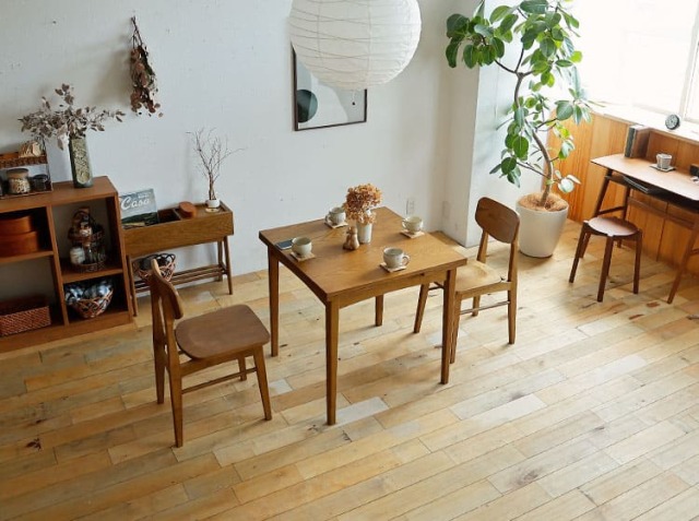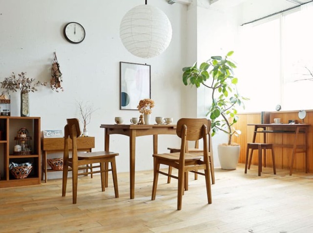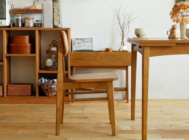 オーク材の木目や自然な風合いが最大の魅力です。時間が経つにつれて深まる木の味わい(経年変化)を楽しむことができ、空間に温かみと落ち着きをもたらします。