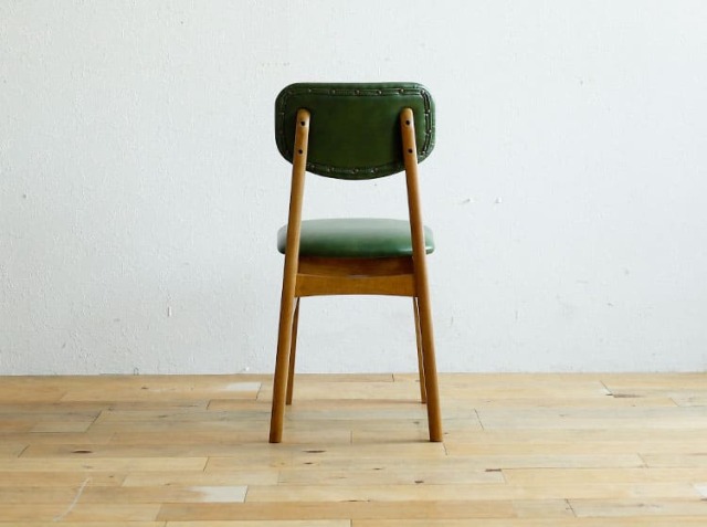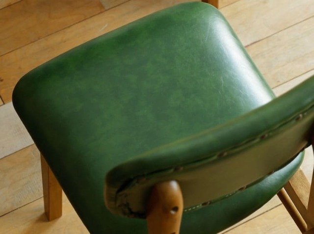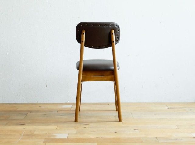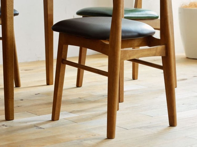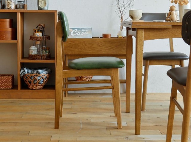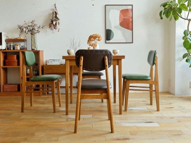 天然木とPVCレザーを組合わせたソフトヴィンテージな佇まいが特徴のダイニングチェア、Rasic(ラシック)。カラーは、ブラウンとヴィンテージグリーンの2色からお選びいただけます。