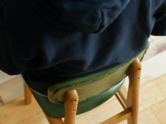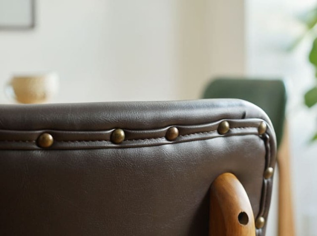 体を包み込んでくれるように弧を描いた背もたれ部分は、座った時にしっかり背中にフィットしてくれて安心感がうまれるデザインに仕上げています。背面から見える鋲(びょう)が、雰囲気をさらに強調し、デザインのアクセントになっています。