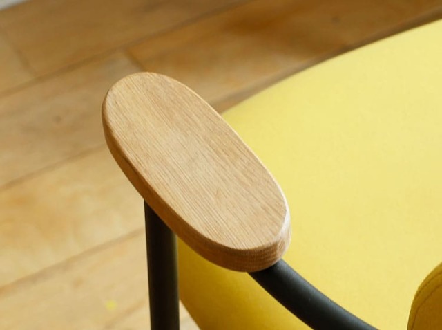 オーク無垢材を使用した肘掛け部分。コロンと丸いデザインがかわいらしさも感じさせてくれます。角面は面取り加工が施されていますので、背中をもたれたときやひじ掛けにひじを置いたときに痛くならず快適にお過ごしいただけますよ。