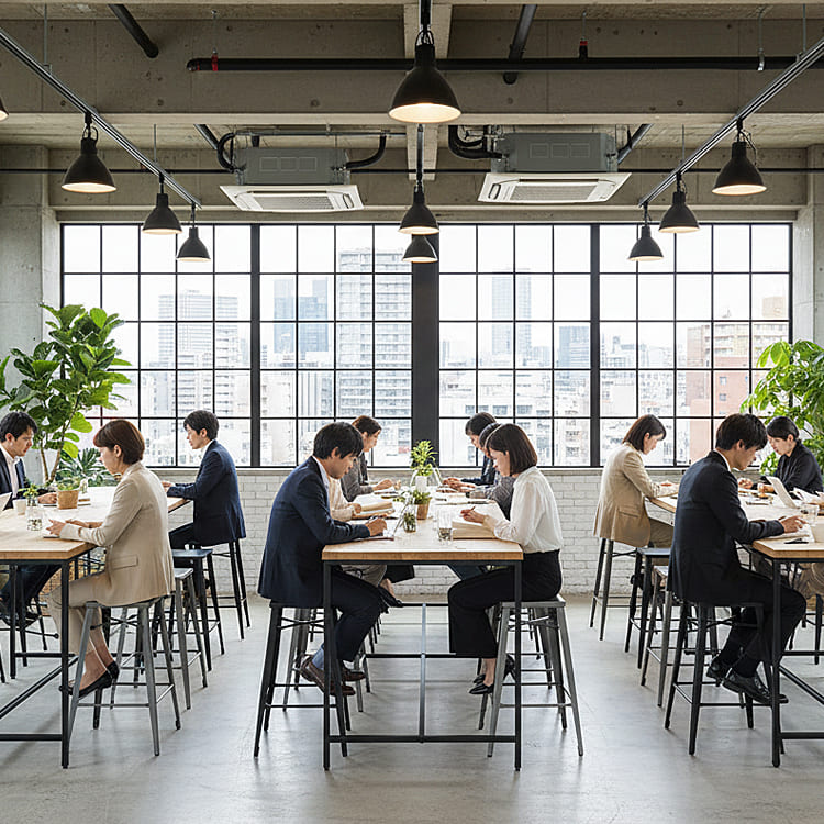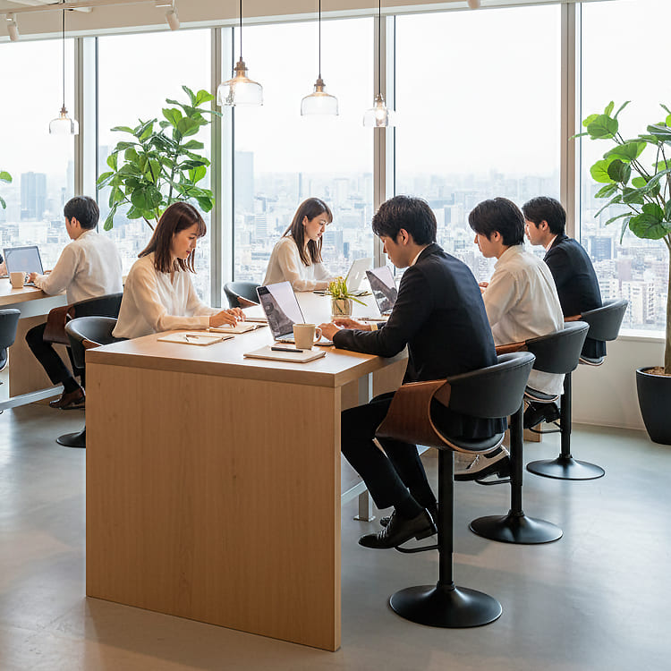 従来の固定デスクから、フリーアドレスやコワーキングスタイルへ。働き方の多様化に伴い、オフィス空間のあり方も大きく変化しています。今回ご紹介するのは、ハイテーブルとバーチェアを組み合わせた、開放的で機能的なワークスペースの導入イメージです。