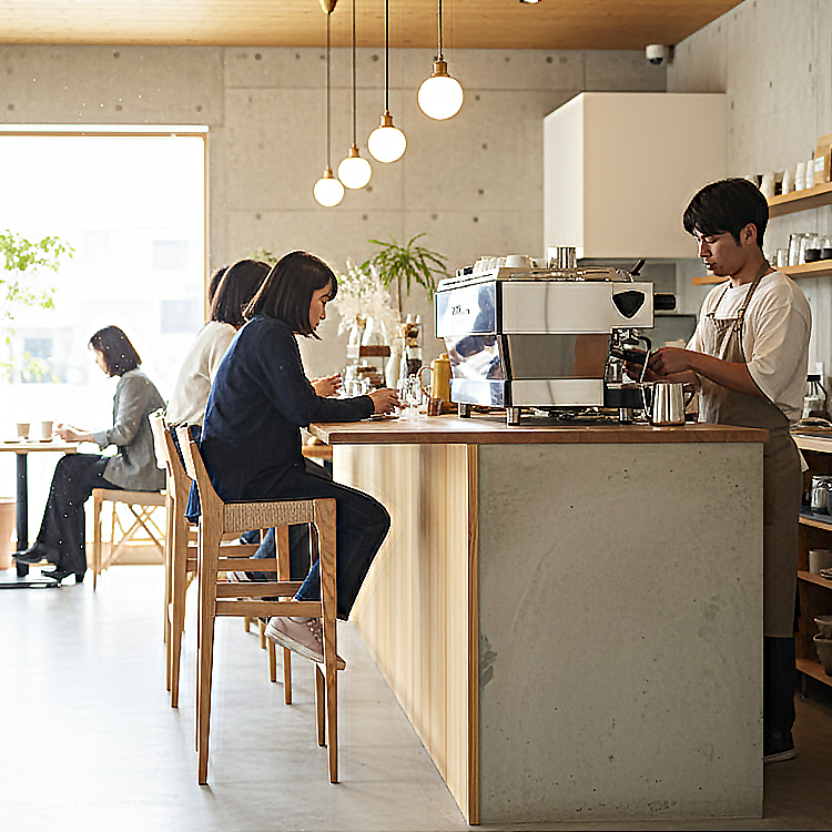 木製カウンターとエスプレッソマシンのあるモダンなカフェ空間に、ナチュラルウッドのバースツールを配置。ペーパーコードなどの温かみのある素材感が、カフェの居心地の良い雰囲気を演出します。