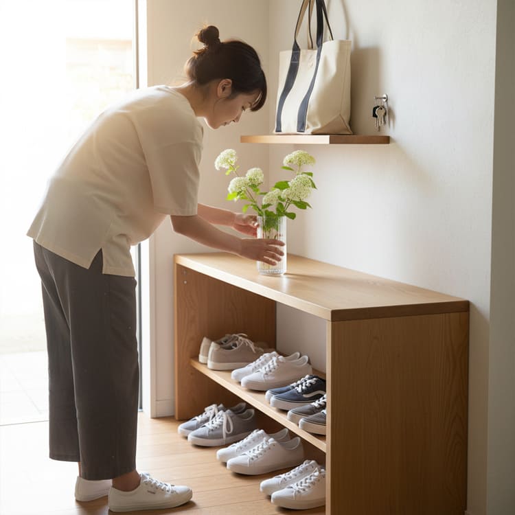 出かける前、玄関の鏡の前でアレンジメントの最終チェック。少し傾いた枝を直したり、位置を微調整したり。帰宅時に一番最初に目に入る場所だからこそ、丁寧に整えます。バッグを肩にかけ、鍵を手に取る、そんな日常の動線の中に、花を飾る習慣が自然と溶け込んでいます。