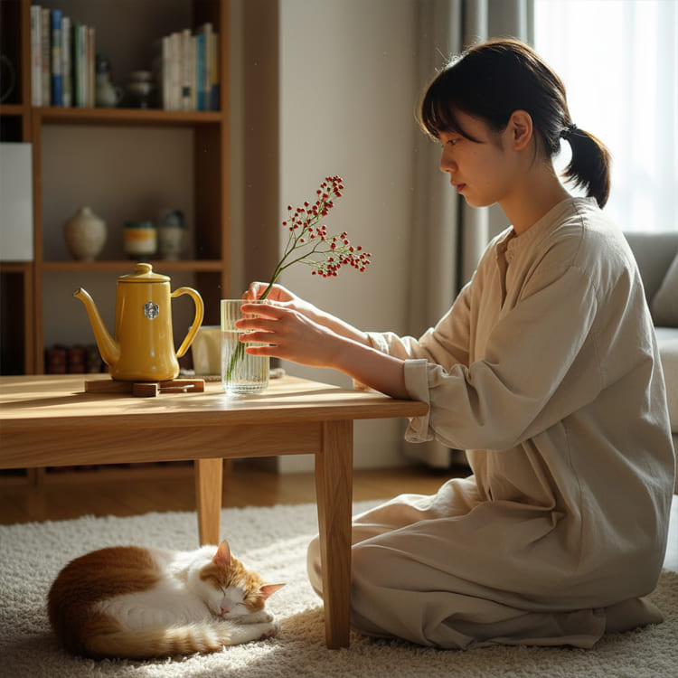 休日の午後、リビングの床に座り込んで、じっくりとアレンジメント。ローテーブルに花材を広げ、猫が興味津々で覗き込む中、枝の向きを変えたり、バランスを見たり。急がず、自分のペースで。クッションに寄りかかりながら、好きな音楽を流して、自分だけの時間を楽しみます。