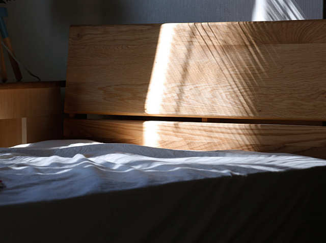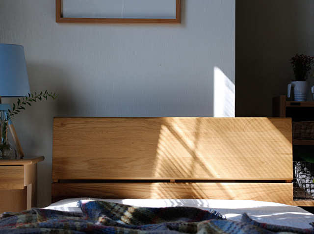 夜寝るとき、ヘッドボードに背中を持たれながら間接照明などの温かみを感じる灯りに照らされた無垢材の表情、そして朝、太陽の陽ざしを浴びている表情。オーク無垢材のきれいな木目は本当に優しい雰囲気を感じます。