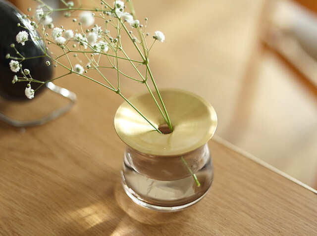 真鍮のプレートの中央部分に穴があいていて、茎や枝を支えてくれるので、少ない本数のお花も安定して飾ることができます。球根の根っこを通したり、多肉植物の水耕栽培にも。真鍮のプレートを外して、シンプルなガラスの花瓶としても使えるので、シチュエーションに応じて飾り方を変えてお楽しみいただけますよ。