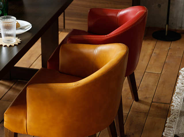 ナチュラルヴィンテージテイストのデザインで、優しさや温かみを感じさせるダイニングチェア。全体的なイメージは、丸みを持たせたフォルムが印象的で、バイキャストレザーで座面全体を包み込んだ仕様にすることで、より重厚感が増し、高級感のある雰囲気を醸し出します。座面は固めで安定感が良く、背もたれや肘掛けまでクッションが入っていてソフトな肌あたり。背もたれが低めなのでダイニング空間に圧迫感を与えないのもポイント♪
