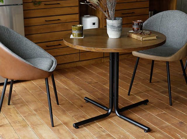 木目が綺麗なオーク材とスチールの組み合わせが、落ち着いた空間を演出してくれる直径80cmの円形ダイニングテーブル。お家にいながら、おしゃれなカフェのようなダイニングにしてくれるインテリアですよ♪天然木の温もりある木目がお料理を華やかに引き立て、楽しい一時を彩ってくれますね。