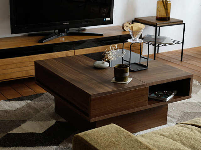 直線的なデザインがスタイリッシュで、重厚感の漂う 国産リビングテーブル、Kashu(カッシュ)。ワンポントのグレーガラスがアクセントになっていて、置くだけでリビングの主役になってしまうリビングテーブルです。75cm角の正方形サイズですのでレイアウトしやすく、どんなリビングシーンにもマッチ!一見デザイン重視に見えますが、実は引出しや収納スペースもあるんです。