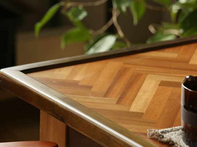 こちらのテーブルの特徴は、何といっても木目がきれいなアカシア材の天然木のもつ自然の濃淡をあえて不規則に配置することでヘリボーン柄に仕上げているところ。