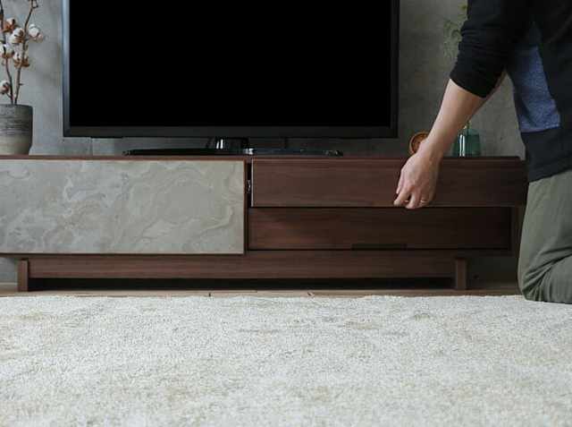 家具の名産地北海道の旭川家具×特許シートの「HANDY STONE」を組み合わせ、上質な空間を演出する幅160cmのローボード、Flav(フレーブ)。