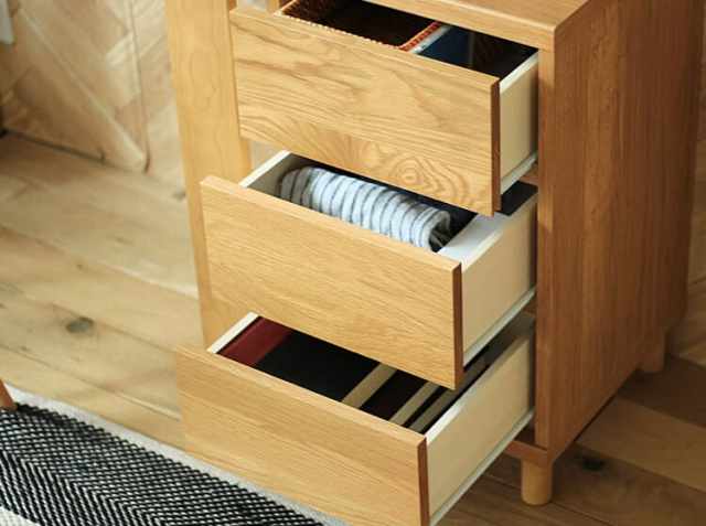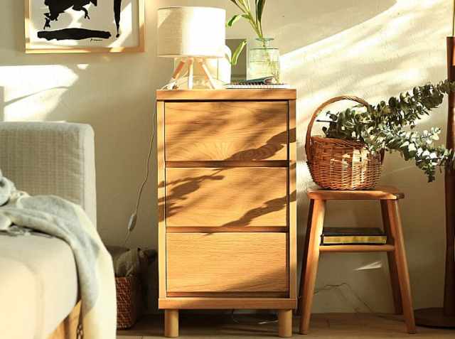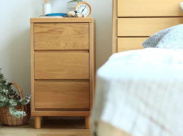 たくさんのものを収納することができる3杯の引出し収納。木目調のナチュラル感やシンプルながらデザイン性を感じるフォルムも特徴。
