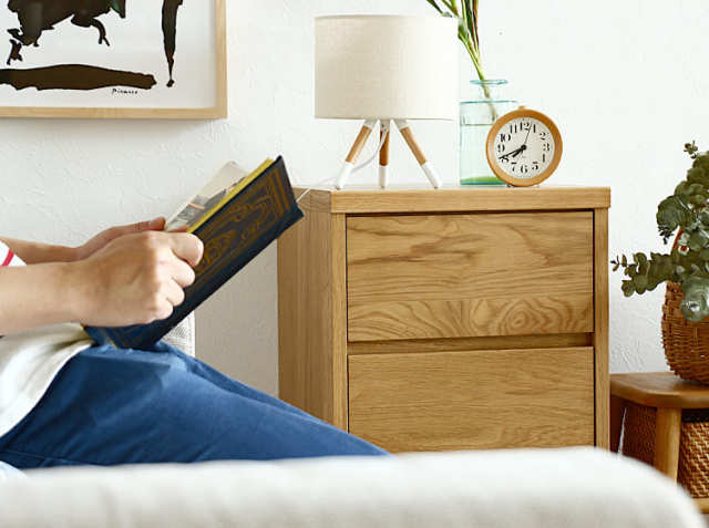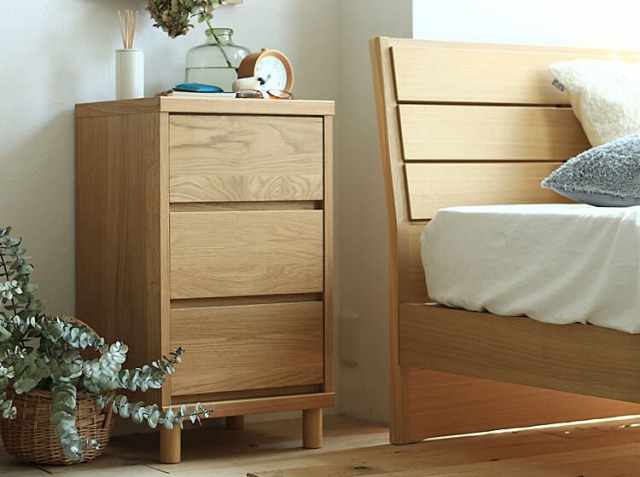 奥行きはスリムな40cmとなっていますので、お部屋に圧迫感をあたえることはありません。ホテルのベッドには一般的にナイトテーブルが置いてありますよね。ツインの場合は2台のベッドの間に1台、ダブルの場合はベッドの両サイドに2台配置されています。スリムなサイズですのでベッドサイドに置くだけでおしゃれなホテルライクインテリアの完成ですね♪