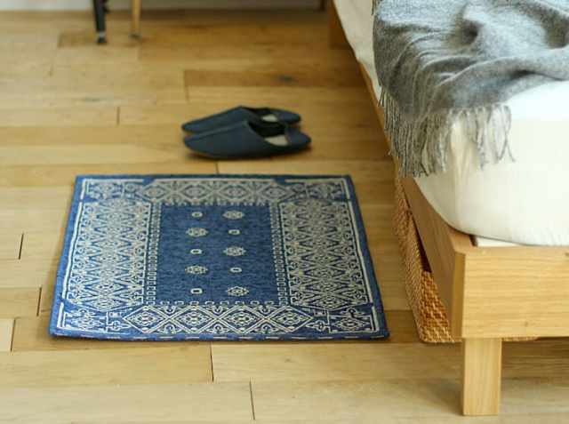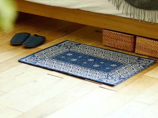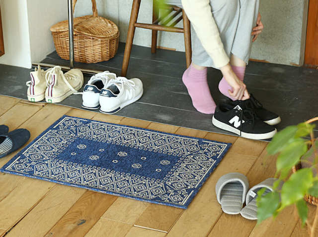 ヴィンテージ感溢れるペイズリー柄のバンダナマット。ポリエステル100%の表面はサラサラとして、素足で歩くと気持ちよく、裏面には滑り止め加工が施されていますので、ずれにくくなっています。また床暖房やホットカーペットにもご使用いただける耐熱加工が施されていますので、玄関だけではなく、キッチンや寝室、洗面所などでもご使用できますよ。