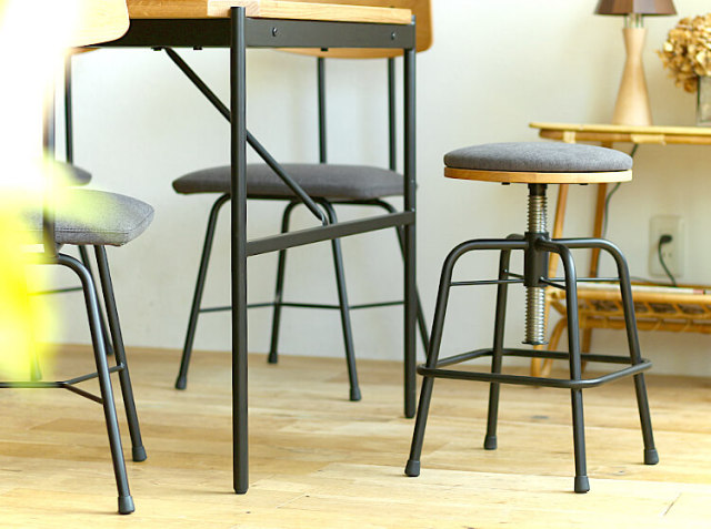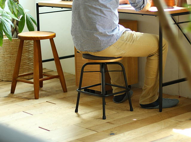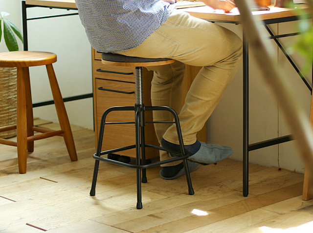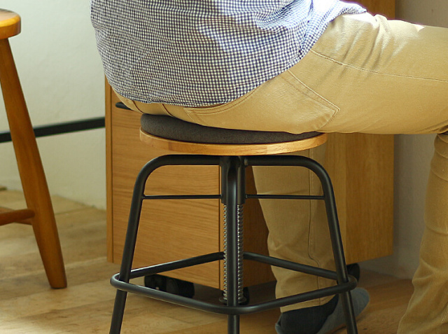 こちらのスツールは、座面部分をクルクルと回すと、高さ調整が43cm~55cmの間で可能となっています。