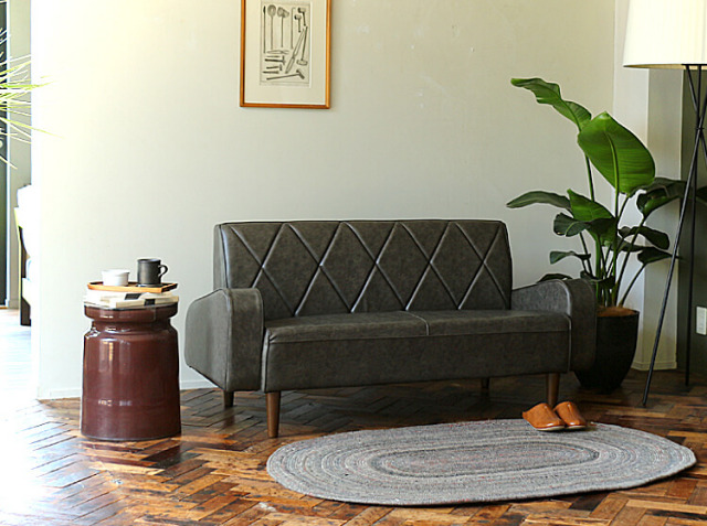 天然木を使用した脚部とヴィンテージレザーのような加工が施された抗菌PVCブラックレザーを使用し、上品な雰囲気を醸し出しながらも、色々なお部屋のテイストにマッチするシンプルさが特徴のソファとなっています。