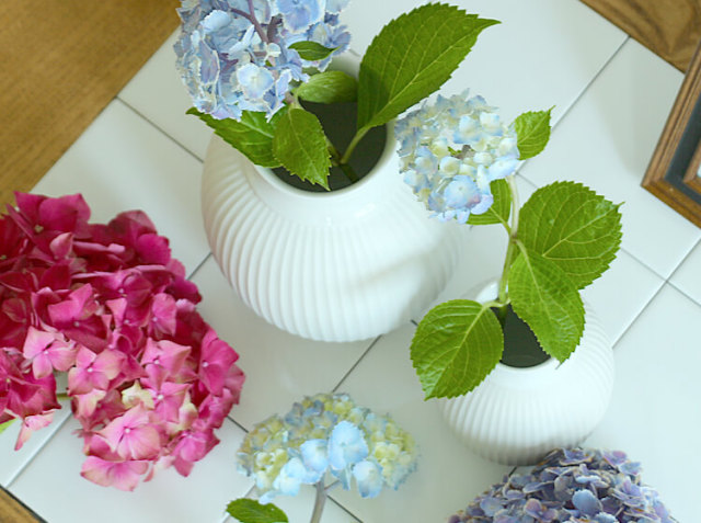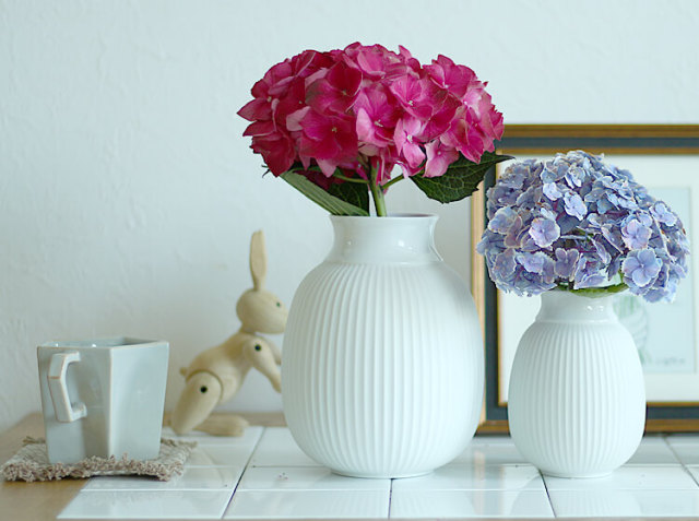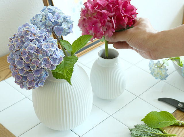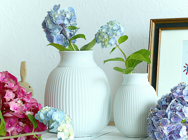 お気に入りのお花屋さんで季節の草花を購入し、少し短く枝を切り、1本、また1本と挿していきました。今の季節はやっぱり紫陽花♪食卓の上やキッチンカウンター、収納棚などに置くだけで、暮らしの中に豊かさを感じさせてくれますよ♪