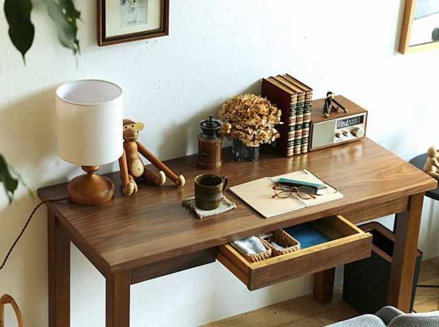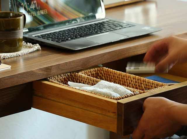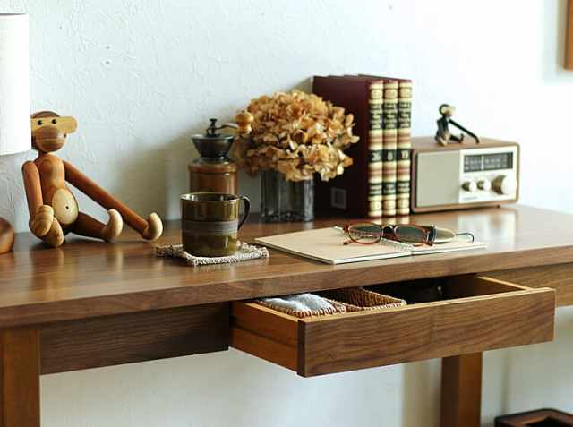 またパソコンなどのOA機器や書類などに囲まれ、無機質なイメージになりやすい書斎やワークスペースを一新してくれるのがこちらのデスク。天板にはウォールナットの落ち着いた雰囲気ですので、温かみを感じるデザインが書斎やワークスペースをセンスアップしてくれますよ。