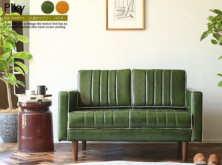 アメリカンヴィンテージスタイルをイメージしたヴィンテージグリーンカラーとナチュラルヴィンテージスタイルをイメージしたブラウンカラーの2種類からお好みに合わせて選べる国産2人掛けソファー、MS(エムエス)。