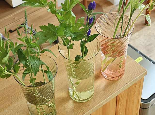 お花を活けるって難しいと感じることも多いかもしれません。でもお花屋さんでたまたま見つけたお気に入りの季節の草花をシンプルに活けるだけで、なんだか幸せな気持ちになりますよね♪花瓶にお水を注いで、少し長めに茎をカット!斜めに切ると切断面が広くなって水揚げ効果が高くなるそうです。生花以外でも枝ものやドライフラワーも似合うのがクリスタルベースの特徴。季節の草花を楽しく活けて、四季の移り変わりをお家の中で楽しみませんか。