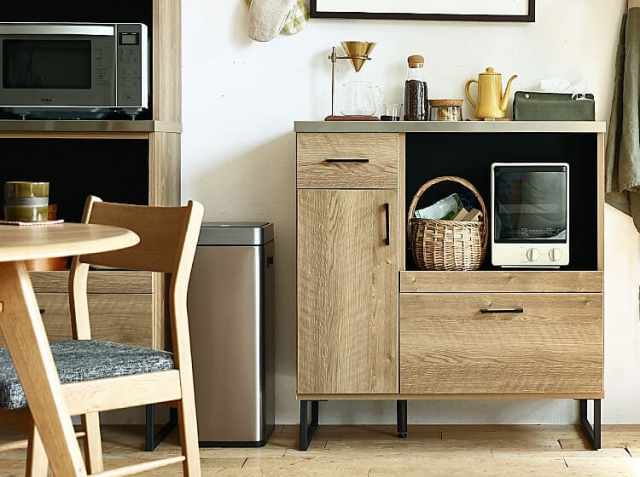 カフェのような雰囲気ある空間を演出する高いデザイン性に加えて、キッチンの作業効率を高める、豊富な収納力も備えているのも嬉しいポイント♪ステンレスの天板は調理をする作業台として使ったり、毎日使う珈琲ウェアなどを置いたりと便利です。食器をすっきり収納できる板戸扉収納、 炊飯器などの収納に適したスライド棚、細かいものから大きいものまで収納力抜群の2杯の引き出し収納。 キッチン周りの家電・食器・小物・食品などをすっきりひとまとめに収納して頂けます。