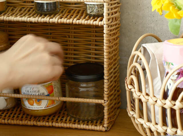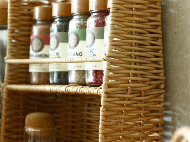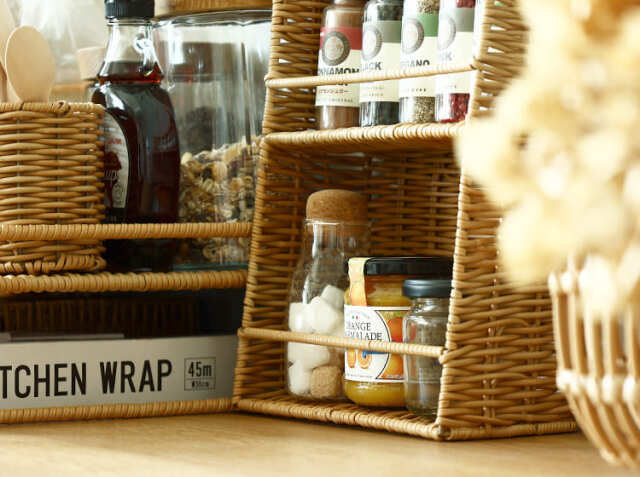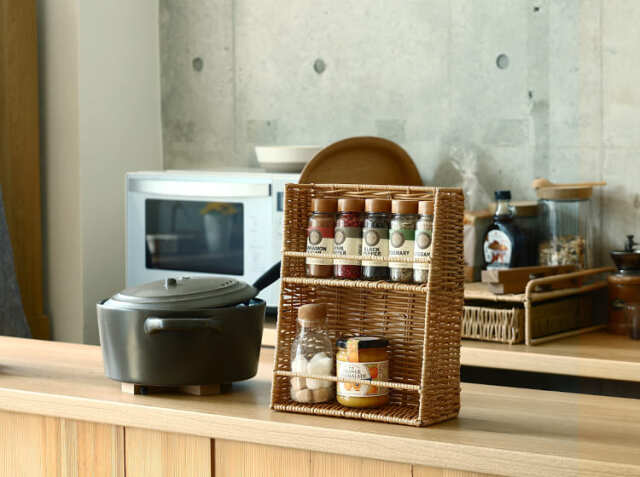 まるで本物のラタンで編まれたようなスパイスラックに並べれば、いつもの景色も見違えます。