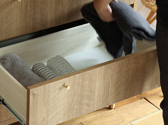 リビングやダイニング、寝室周りの小物や衣類などをたっぷりと収納することができる便利な引出し収納。雑多に散らかりやすい文具などを収納したりするのにとても便利♪