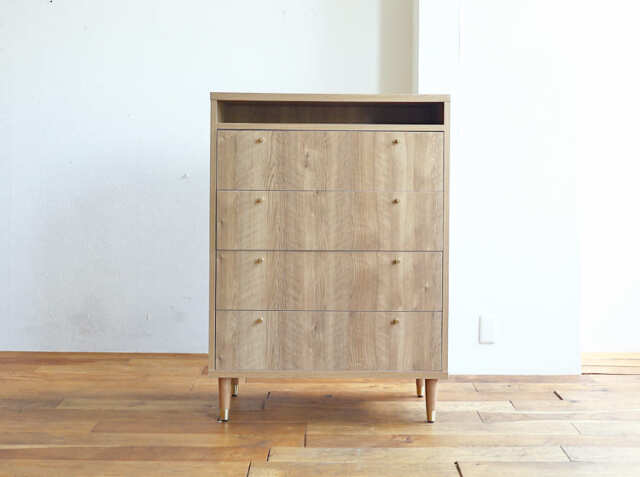 シンプルなデザインながら、用途によって使い分けができる引出しが計4杯もありますので、収納力はバツグン。その優しい風合いと引き出しのゴールドカラーの取っ手がマッチして、とっても可愛いアイテムとなっています。