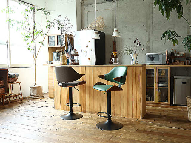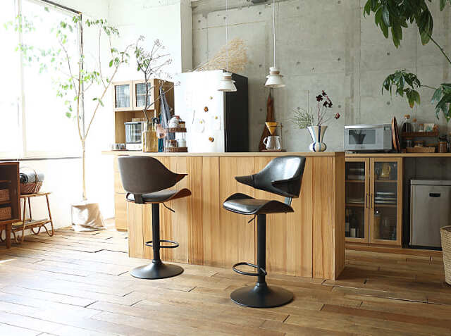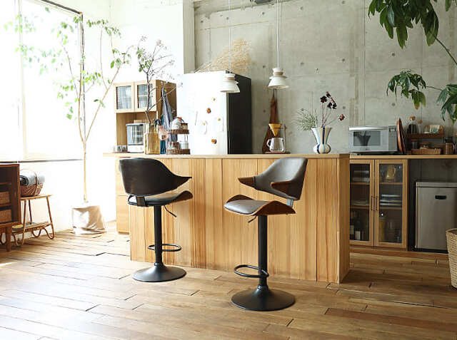 木製・コンクリート調・レンガ調などの落ち着いた雰囲気のキッチンカウンターに、ヴィンテージを感じる佇まいのカウンターチェアを置くと、昔ながらのカフェのような雰囲気を楽しむことができます。