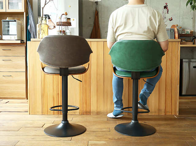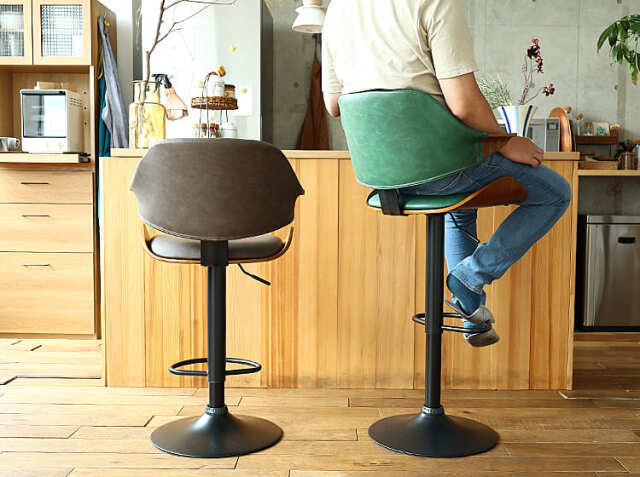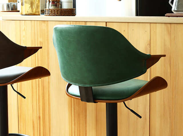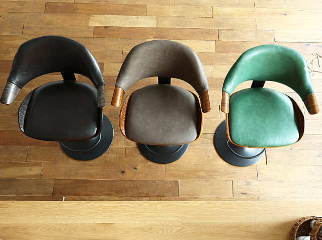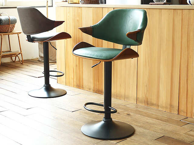 お部屋のインテリア性をワンランク上の上質な空間に仕上げてくれる天然木とPUレザーを組み合わせたヴィンテージテイストのカウンターチェア、Letop(リトップ)。エイジング加工が施されたレザーと曲線を描いたひじ掛けや座面部分の曲木が、いつものキッチンカウンターを昔ながらのカフェのような雰囲気にしてくれますよ。カラーは、お部屋のテイストに合わせて選べるグリーン、ブラウン、ブラックの3色からお選び頂けます。