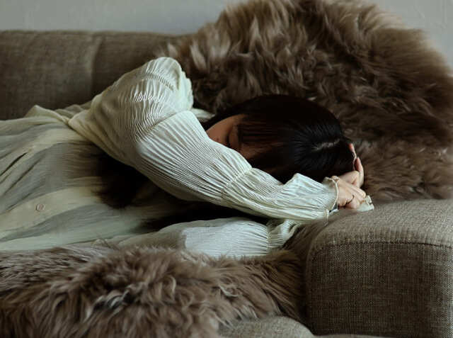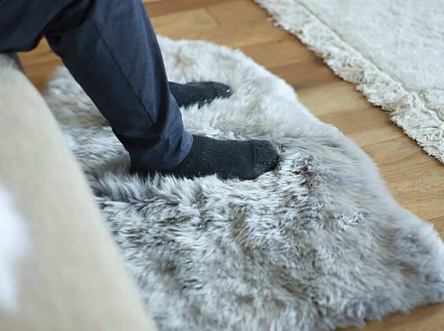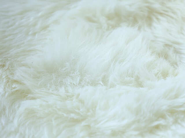 毛足は約10cmと長めのムートンに手をつくと指先が埋もれて下地が見えないほど。