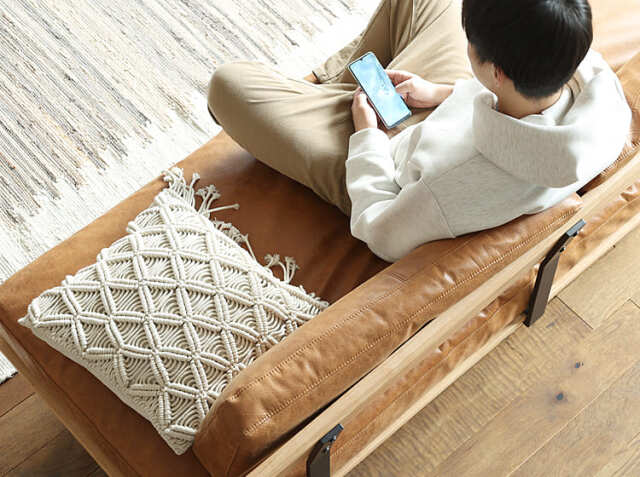 座面の幅は182cm。大人の方が2人で座っても余裕のあるサイズ感となっています。奥行きも広くとっていますので、深く腰を掛けたり、あぐらをかくこともできるサイズ設計に仕上げています。※モデル身長:約171cm