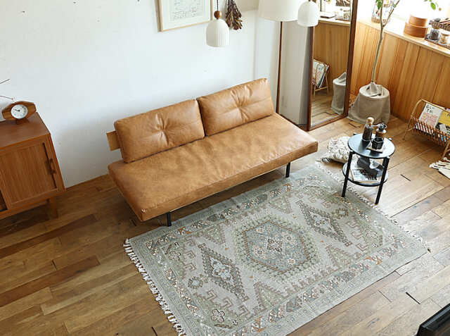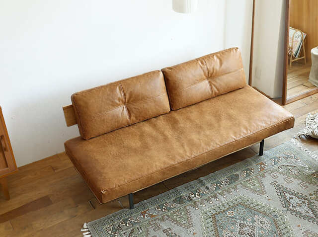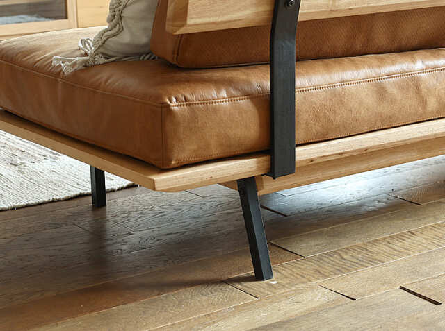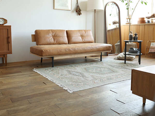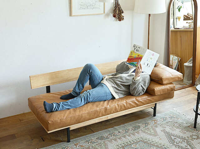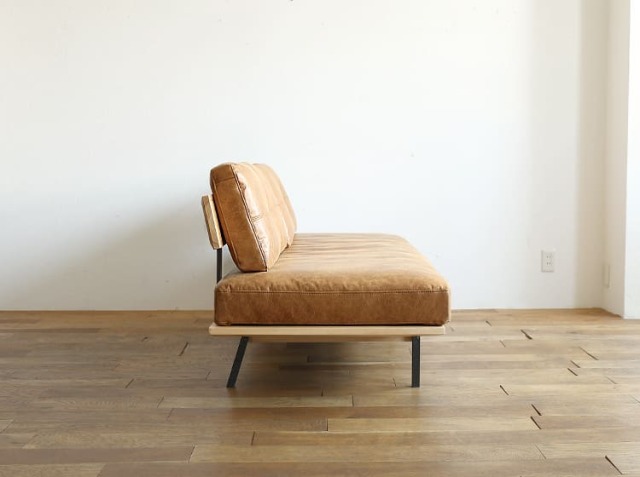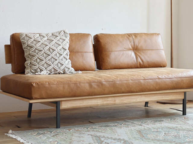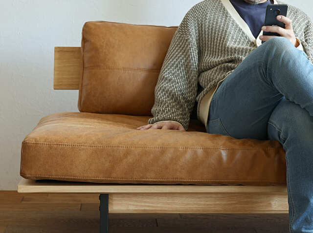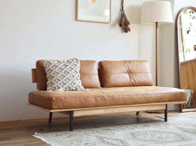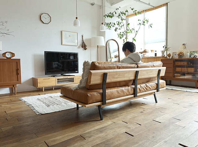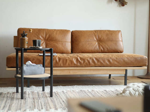 天然木ラバーウッド無垢材&キャメルカラーのクロスレザーの組み合わせがヴィンテージテイストのコーディネートにぴったりの3人掛けソファー、form(フォーム)。