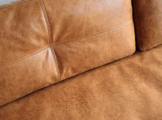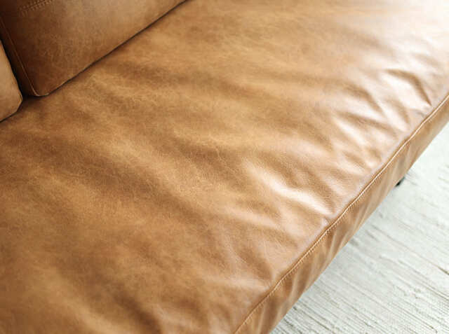 特殊なエイジング加工が施されたクロスレザーは、ヴィンテージ家具のようなムラやカスレが品の良い表情を作り出しています。光の当たり具合で趣のある表情に変化をさせるのもポイント。クロスレザーの特徴は、なんといっても撥水性。水などこぼした際もサッと拭き取れてメンテナンスはとても簡単なのでご家庭でも使いやすい素材です。